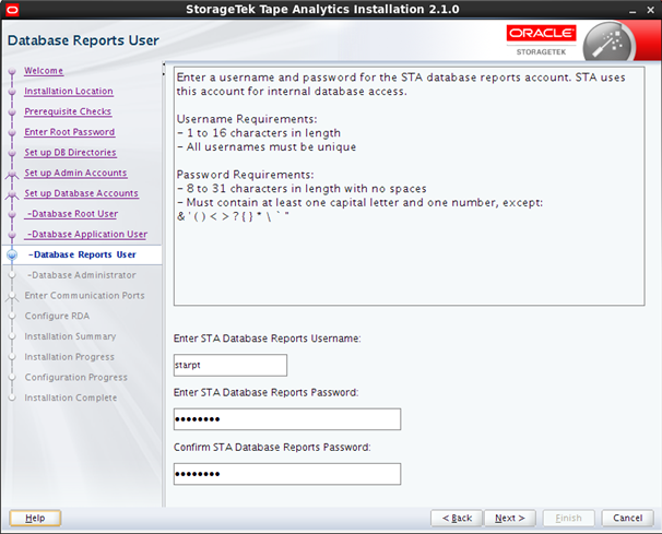 Saisissez le nom que vous souhaitez affecter au compte de rapports de base de données STA, starpt par exemple.