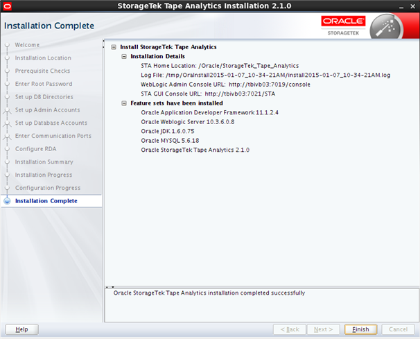 Détails de l'installation : Emplacements du fichier journal du programme d'installation et de l'application STA, et détails de la connexion des interfaces utilisateur de l'application STA et de WebLogic.