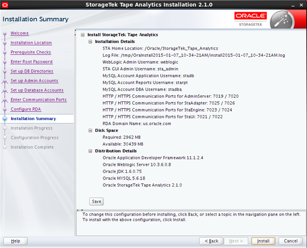 L'écran affiche les détails suivants relatifs à l'installation. Vous pouvez enregistrer ces informations dans un fichier texte pour vos archives.