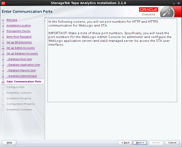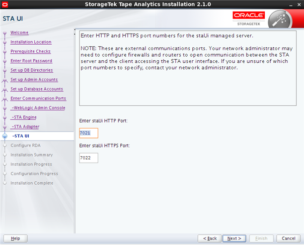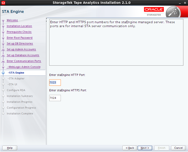Vous fournirez les valeurs des ports configurables WebLogic et STA internes et externes . Ces ports seront configurés et activés pendant l'installation avec les valeurs que vous indiquerez. Les numéros de ports que vous indiquerez doivent être uniques, et les ports doivent rester disponibles et dédiés à STA.