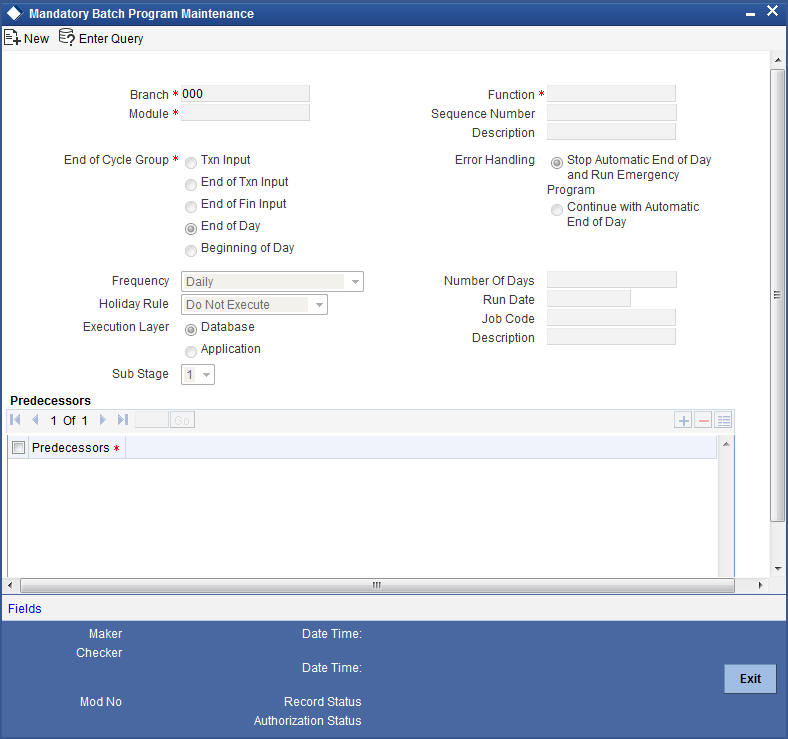 Batches are run automatically. In the mandatory programs, all batches whichever are required will be maintained in sequence and that is triggered automatically as based on the maintenance in the ‘Mandatory Batch Program Maintenance’ screen.