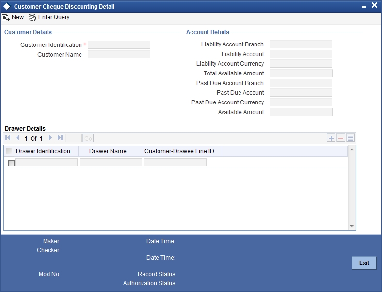 The system displays the liability Id if the drawer is a bank customer. However you can specify the liability Id for a drawer, when a cheque discounting transaction is input, the limit utilization for the drawer will be tracked against this liability.
