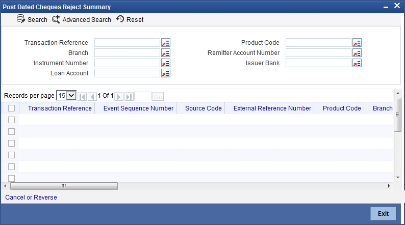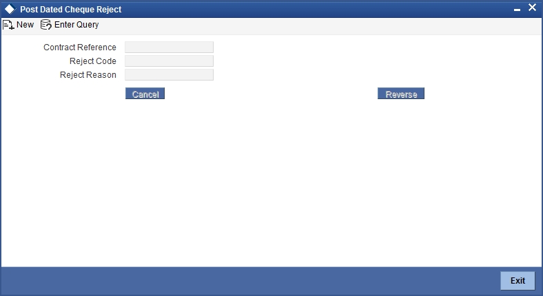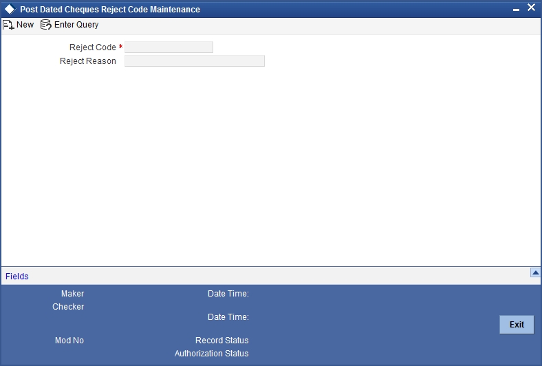 You can maintain reject codes that are applicable to the rejection of post dated cheques using ‘Post Dated Cheque Reject Code Maintenance’ screen. To invoke this screen, type PDDRJCOD’ in the field at the top right corner of the application toolbar and click the adjoining arrow button.