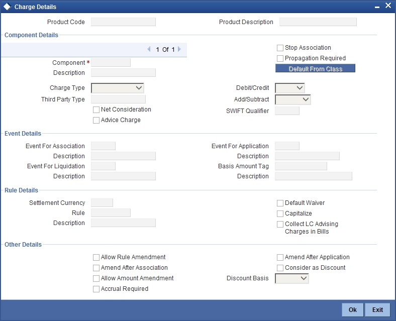 You can check this box only for Export type of LC. If this option is checked in the charge class, you can modify this checkbox at product level. In case if this charge component is linked for Import LCs then this option gets defaulted as ‘N’.