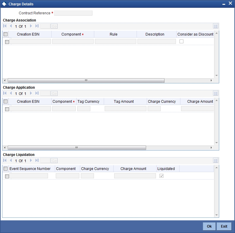 The charge details pertaining to the contract are specified in the ‘Charge Details’ screen. You need to invoke this screen from the ‘Contract Online’ screen. The ‘Charge Details’ screen is invoked as follows for the different modules of Oracle FLEXCUBE: