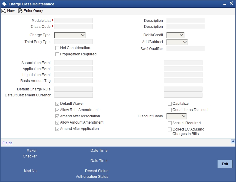 In Oracle FLEXCUBE, you can define the different types of charges or fees that apply on a product as ‘classes’. A charge class is a specific type of charge component (E.g. ‘Charges for amending the terms of a contract’).
