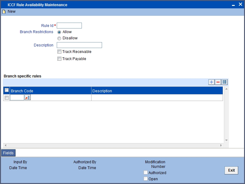 In the ‘ICCF Rule Availability Maintenance’ screen, you can maintain ICCF rules, which you can make available to desired branches. You can do this by maintaining a list of branches for which the use of the rule is allowed, or disallowed. You can invoke this screen by typing ‘CFDICCFR’ in the field at the top right corner of the Application tool bar and clicking the adjoining arrow button.