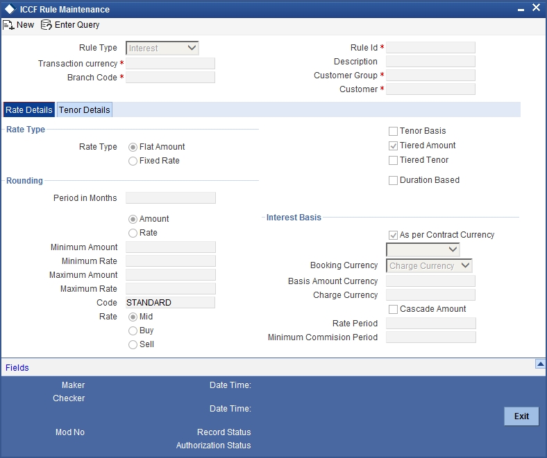 A charge rule is built with the logic to calculate a specific type of charge component. You can maintain this logic in the ‘ICCF Rule Maintenance’ screen. You can invoke this screen by typing ‘CFDRUMNE’ in the field at the top right corner of the Application tool bar and clicking the adjoining arrow button.