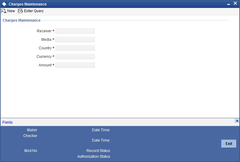 On the messages that are generated from Oracle FLEXCUBE, you can levy charges. You can define these charges for a Receiver, Media and Country combination. You can define these charges in the ‘Message Charges Maintenance’ screen, which is invoked from the Application Browser. You can invoke this screen by typing ‘ MSDCHRMN