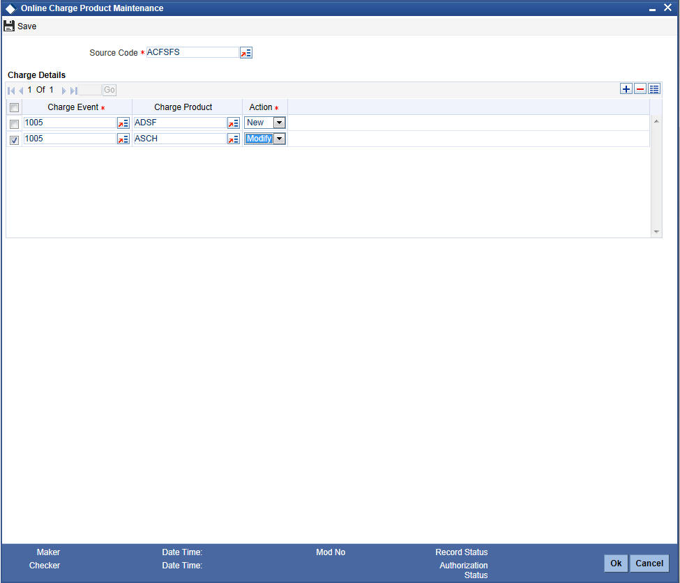 Oracle FLEXCUBE allows you to maintain charge products and events in the ‘Online Charge Product Maintenance’ screen. You can invoke this screen by typing ‘STDCHGMN’ in the field at the top right corner of the Application tool bar and clicking on the adjoining arrow button.