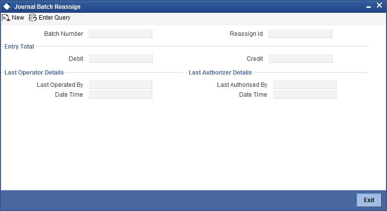 To reassign a batch to a different user click on Jrnl/Teller Batch Op in the Application Browser. Choose Reassign Batch displayed under it. The ‘Batch Reassign’ screen will be displayed.