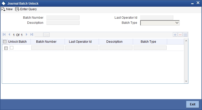 While entering a transaction through Journal Single and Multi Offset entries, if you have not checked the option ‘Batch Close’, the system locks the batches in. You can unlock such locked journal batches using Journal Batch Unlock screen. To invoke the screen, type ‘DEDBATUK’ in the field at the top right corner of the Application Browser and click the adjoining arrow button.