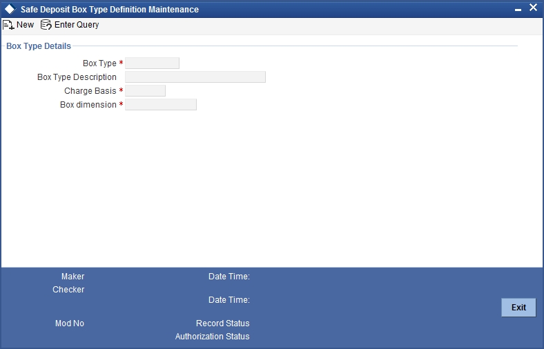 You need to define the type and size of the safe deposit boxes that you will be offering your customers. You can do this in the ‘SDB Box Type Definition Maintenance’ screen. To invoke this screen, type ‘DLDBXTDF’ in the field at the top right corner of the Application Toolbar and then click the adjoining arrow button.