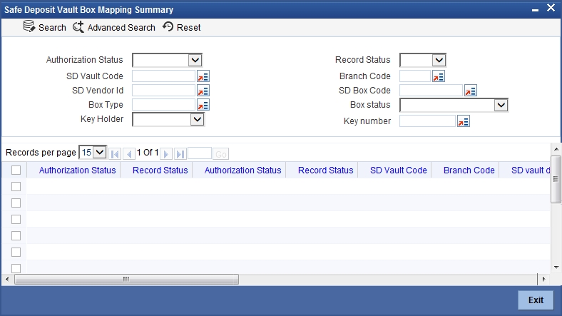 You can query and view the details of vault and box mappings maintained in the system in the ‘SDB Vault Box Mapping Summary’ screen. To invoke this screen, type ‘DLSVLBXM’ in the field at the top right corner of the Application Toolbar and then click the adjoining arrow button.