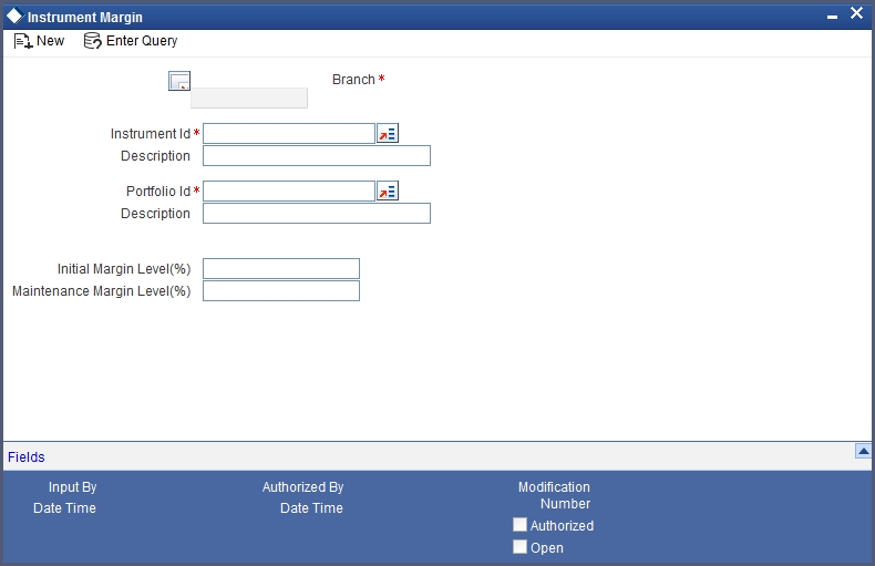 Initial and maintenance margins are maintained at the instrument level for a combination of instrument ID and portfolio. The ‘Instrument Margin’ screen can be used to capture details regarding percentage of initial and maintenance margins for each open contract.