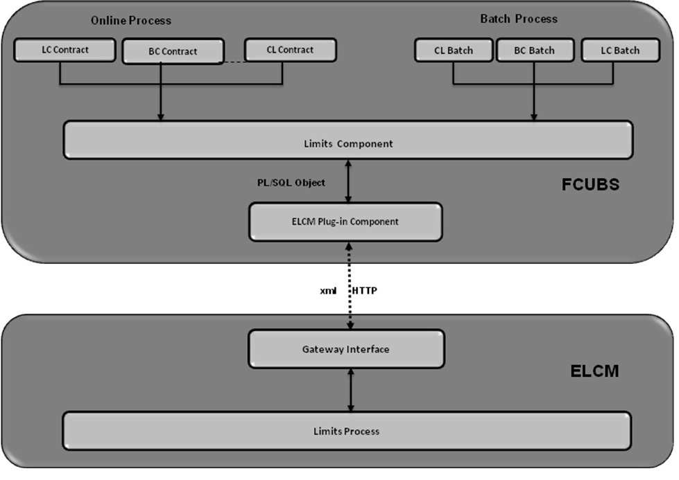 The Oracle FLEXCUBE Enterprise Limits and Collateral Management (hereafter referred to as Oracle FLEXCUBE ELCM) system receives Utilization Transactions (or contracts) from different external product processing systems. These external systems include Loans systems, Treasury systems, Trade and Finance systems and others. The bulk of the contract details will remain with these external systems and the only the details required for processing will be sent to Oracle FLEXCUBE ELCM.