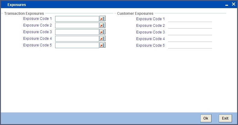 Click the ‘Exposures’ button. In the screen that is displayed, you can specify the transaction exposures that the system should track while processing utilization requests. The system defaults the customer exposures.