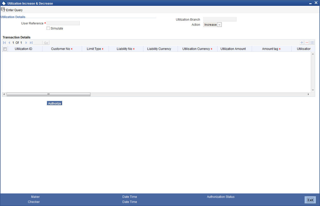 A New Utilization transaction can be entered as Authorized Online or Unauthorized. If the transaction is not authorized online, then Oracle FLEXCUBE ELCM provides the facility to authorize the inputted transaction.