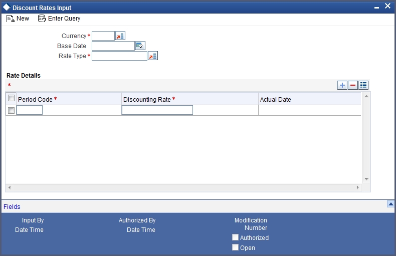 You can associate values to all the User Defined fields created and attached to the ‘Discounting Rate Maintenance’ screen. You can view the list of User Defined fields associated to this screen by clicking ‘Fields’ button in the ‘Discounting Rate Maintenance’ screen.