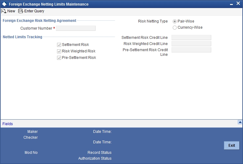 You can associate values to all the User Defined fields created and attached to the ‘Foreign Exchange Risk Netting Agreement’ screen. You can view the list of User Defined fields associated to this screen by clicking ‘Fields’ button in the ‘Foreign Exchange Netting Limits Maintenance’ screen.