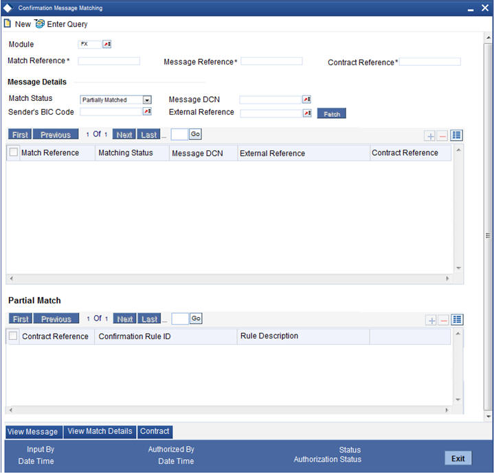 For manual match of the messages, the system fetches all the partially matched and unmatched messages based on the criteria selected in manual matching screen. You can match the partially matched record from the message details screen with a selected partially matched message. The manually matched records will be updated as Active and ‘Match in Progress’. You cannot fetch this message record for another manual matching process. Once the manually matched deals are authorized, the message will be marked as ‘Completely Matched’ and for the related MM contract CONF even is triggered.