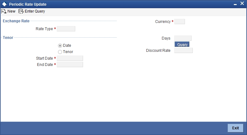 You can maintain discounting rates for the Currency – Rate Type combination for specific tenors (in days). These tenors are referred to as ‘Periods’ in Oracle FLEXCUBE.