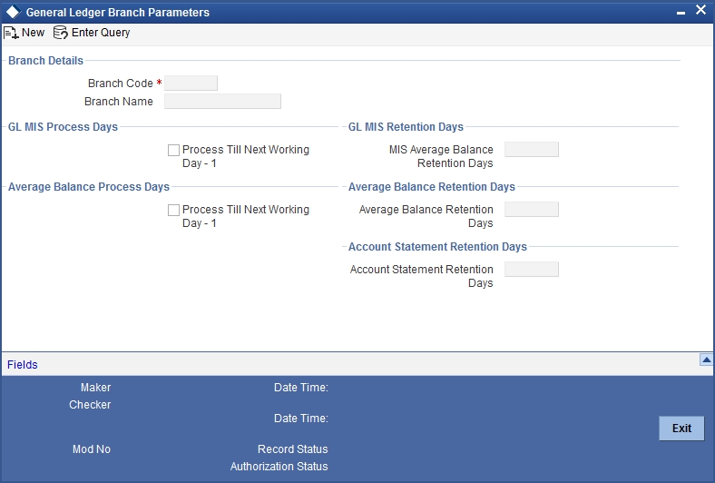 In Oracle FLEXCUBE, each branch of your bank is identified by a unique three-character code called the branch code. This code will be displayed upon invoking the screen.