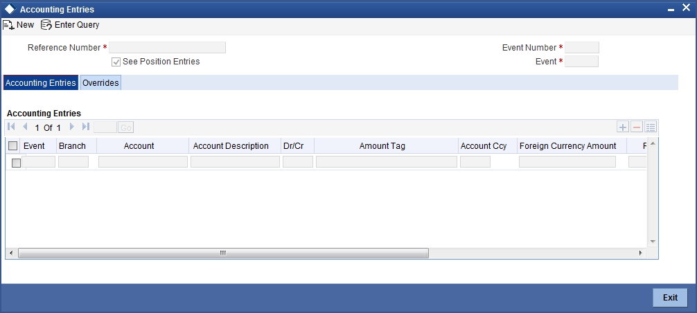 Event | Click this button to view details of the events and accounting entries that the contract involves. The screen also displays the overrides that were encountered for the contract. | |||