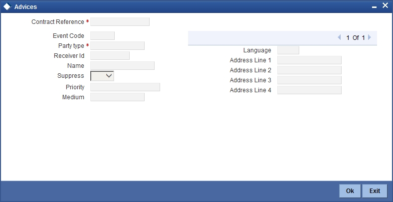 Advice | Click on this button to enter the leg advices. You can view suppress and prioritize the advices that are to be generated for each leg of the transaction. | |||