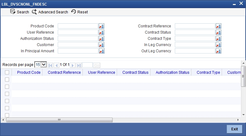 You can view details of all contracts maintained in the system using the ‘Islamic Derivatives Contract Summary’ screen. You can invoke this screen by typing ‘IDSTRONL’ in the field at the top right corner of the Application tool bar and clicking the adjoining arrow button.