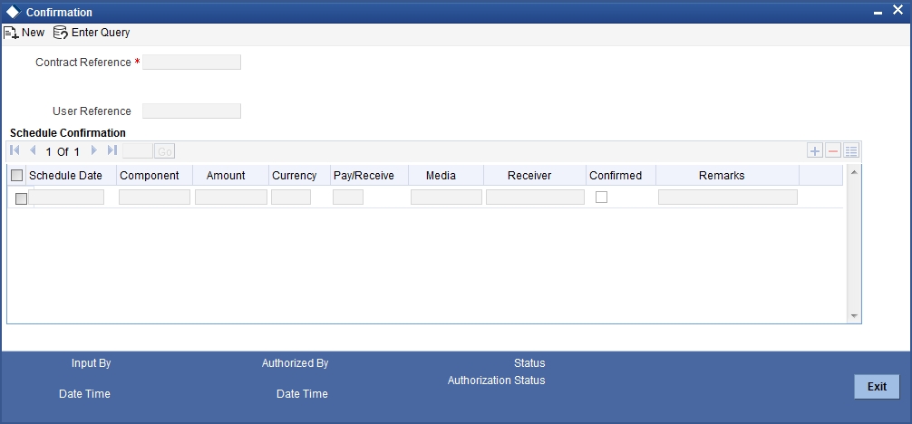 The profit and principal schedules (for Single / Cross currency swaps) defined for an Islamic derivative contract would typically be confirmed by the counterparty involved in the contract. In Oracle FLEXCUBE you can capture the details of each such confirmation received.