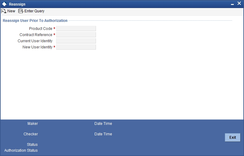 You can invoke the ‘Islamic Derivatives Contract Reassign’ screen by typing ‘IDDTREAS’ in the field at the top right corner of the Application tool bar and clicking on the adjoining arrow button.