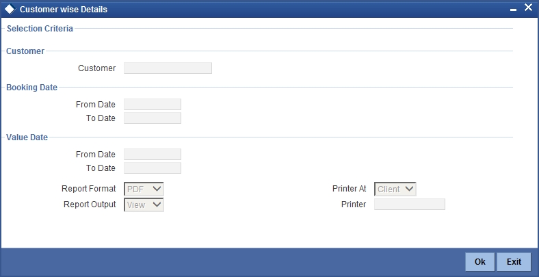 The parameters specified while generating the report are printed at the beginning of the report. Other content displayed in the Customer wise Details Report is as follows:
