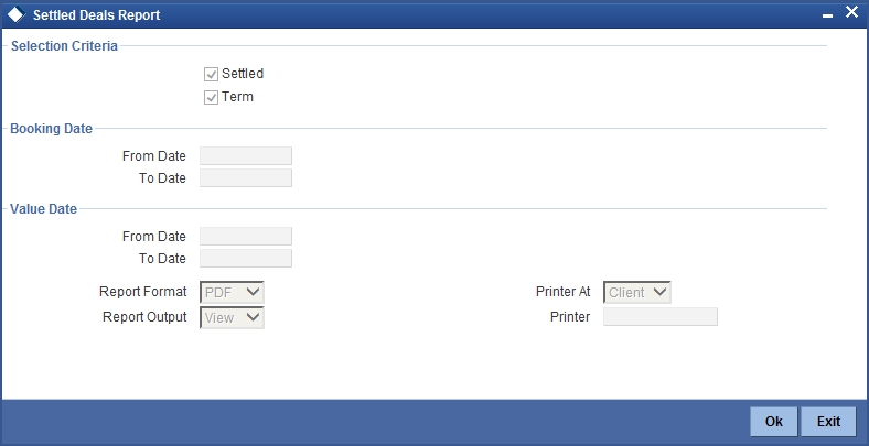 The parameters specified while generating the report are printed at the beginning of the report. Other content displayed in the Settled Deals Report is as follows: