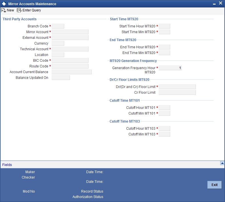A Third Party Account is an account which is located in another bank which is not part of your bank, but is part of the Liquidity Management Account Structure maintained with your bank. The funds can be moved from or to the Third Party accounts. To establish a relationship between the accounts in Oracle FLEXCUBE and the third party accounts, you first need to maintain a mirror account of such accounts as normal CASA accounts in Oracle FLEXCUBE and then capture the parameters of the Third Party Accounts in the ‘Mirror Accounts Maintenance’ Screen.
