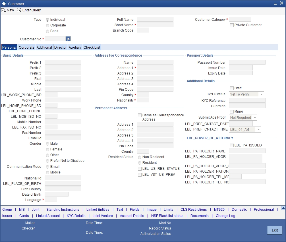 You can invoke the ‘Customer Maintenance’ screen by typing ‘STDCIF’ in the field at the top right corner of the Application tool bar and clicking on the adjoining arrow button.