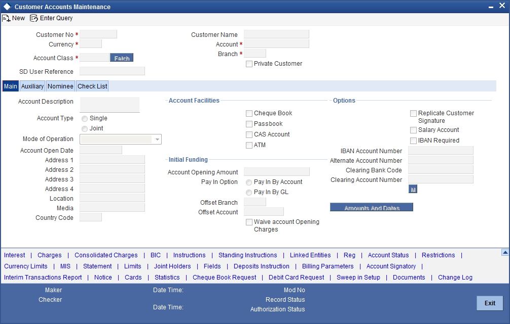 The ‘Customer Accounts Maintenance’ screen is used to create accounts for a given Customer using the desired account class and currency combination. You can invoke the ‘Customer Accounts Maintenance’ screen by typing ‘STDCUSAC’ in the field at the top right corner of the Application tool bar and clicking on the adjoining arrow button.