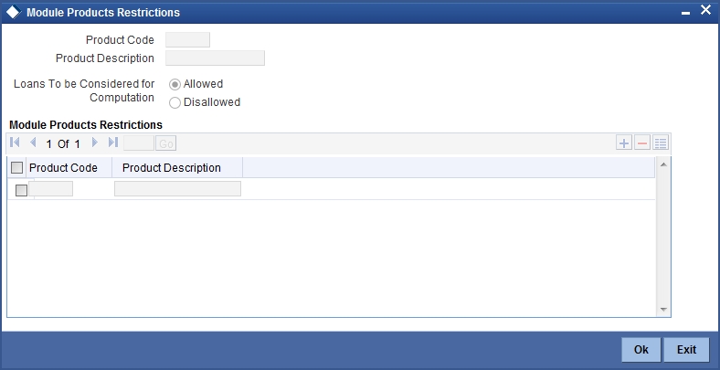 Click ‘Module Product’ button in the ‘Intermediary Product’ screen and invoke the ‘Module Products Restriction’ screen. You can maintain a list of products (from other modules) that should be allowed or disallowed for all transactions under this product.