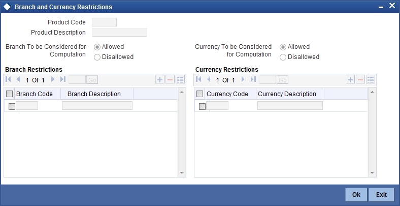 You can maintain a list of branches and currencies that should be allowed or disallowed for all transactions under the product. You can specify such restrictions using the ‘Branch and Currency Restrictions’ screen. You can invoke this screen by clicking ‘Restrictions’ button in the ‘Intermediary Product’ screen.