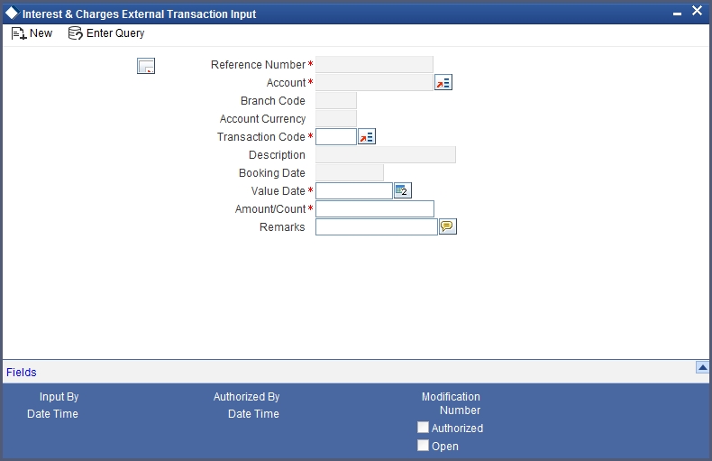 Through the External Transactions screen you can capture the data for NON Oracle FLEXCUBE related charges. You can invoke this screen by typing ‘ICDCHONL’ in the field at the top right corner of the Application tool bar and clicking the adjoining arrow button.