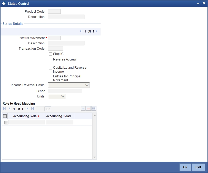 While defining a Profit/Charge product, you can maintain different status codes and specify parameters based on which accrual and application of profit/charges will take place for the status of the account.