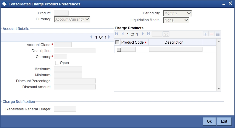 Specify Receivable GL which is to be used for storing debit consolidated charges on a temporary basis from the adjoining option list. You can specify the Receivable GL only for products linked to rules having debit formulae.