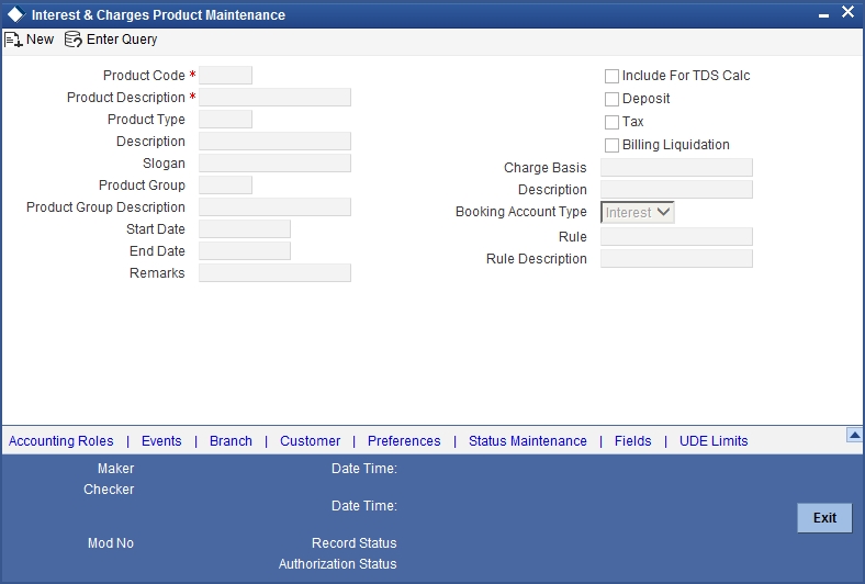 For any product you create in Oracle FLEXCUBE, you can define generic attributes, such as branch, currency, and customer restrictions, accounting roles and heads, etc., by clicking on the appropriate icon in the horizontal array of icons in this screen. For a profit or charges product, in addition to these generic attributes, you can specifically define other attributes. These attributes are discussed in detail in this chapter.