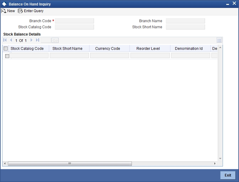 You can use the ‘Balance on Hand Inquiry’ screen to view the current balance stock in a denominations and serial numbers wise break down. The query results are based on the requesting Branch.