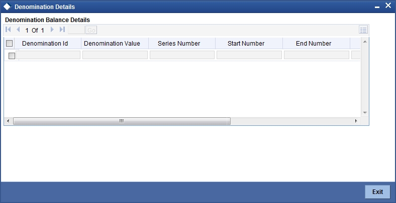 The Denomination Details screen displays the following information as part of Balance Details for a particular Denomination: