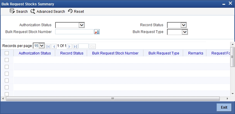 You can use the ‘Bulk Request for Stocks - Summary’ screen to query for Bulk Request records, by specifying the following parameters: