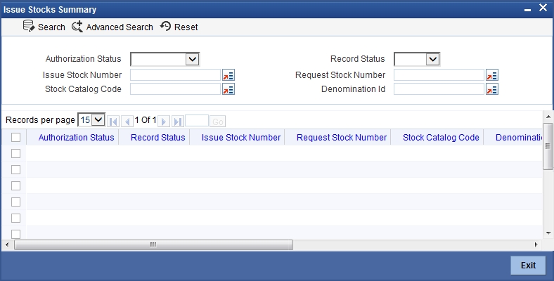You can use the ‘Issue Stocks Summary’ screen to query of Issue Stocks records, by specifying the following parameters: