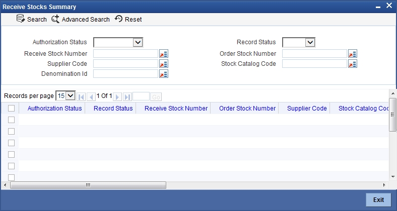 To invoke the ‘Receive Stocks Summary’ screen, enter ‘IVSTXNRO’ in the field at the top right corner of the Application Toolbar and then click the adjoining arrow button.