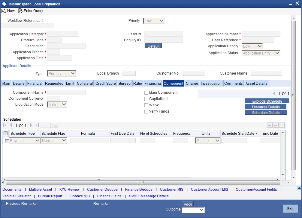 In ‘Component’ tab, the system calculates and displays the payment schedules and the schedule details based on the finance offer selected. If you have selected an ‘Enquiry ID’ for the customer, then the schedule details that have been stored for the corresponding finance proposal are displayed here. You can modify them, if required.