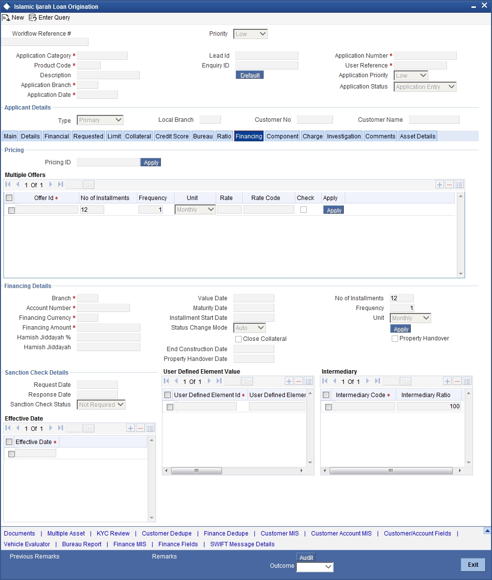 In the ‘Financing’ tab, the system displays the list of the multiple finance offers that are attached to the application category specified. If you have selected an ‘Enquiry ID’ for the customer, then the finance details that have been stored for the corresponding finance proposal are displayed here. You can modify these details, if required.